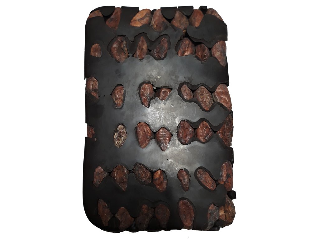 Čokoláda s kakaovými boby, nebo kakaové boby s čokoládou? Toť otázka! Odpovědí je 42. Šest řad po sedmi kakaových bobech, vážících zhruba 50 gramů, je zasazeno do 80% čokolády z Ugandy, která boby drží pohromadě.