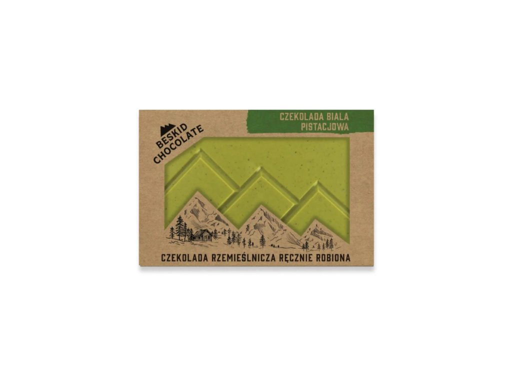 Bílá BEAN-TO-BAR čokoláda 33% s přídavkem 100% pasty z prémiových pražených pistácií. Vysoký obsah 33% kakaového másla a skvělá a neopakovatelná zelená barva čokolády, která je výsledkem přidání 100% pasty z pražených pistácií připravované v místním melanžeru, představuje vysoce originální dárek pro blízké, ale i nevšední chuťový zážitek pro nejen čokoládové gurmány.