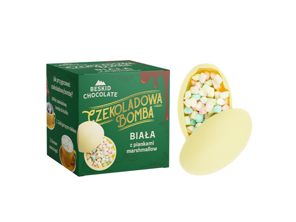 ... tak kdy to vybuchne? Naše čokoládová bomba v podobě poctivé 32 % bílé BEAN-TU BAR čokolády s překvapením! Není to jen tak ledajaké překvapení. Prostě vložte bombu do hrnku, zalijte horkým mlékem a čekejte na explozi barevných marshmallows , které vám připomenou dětství! Dopřejte si tento zážitek sami, nebo vašim blízkým. Krásný obal, který ještě více podtrhuje jedinečný obsah, představuje i dokonalý dárek nejen na dětskou party.