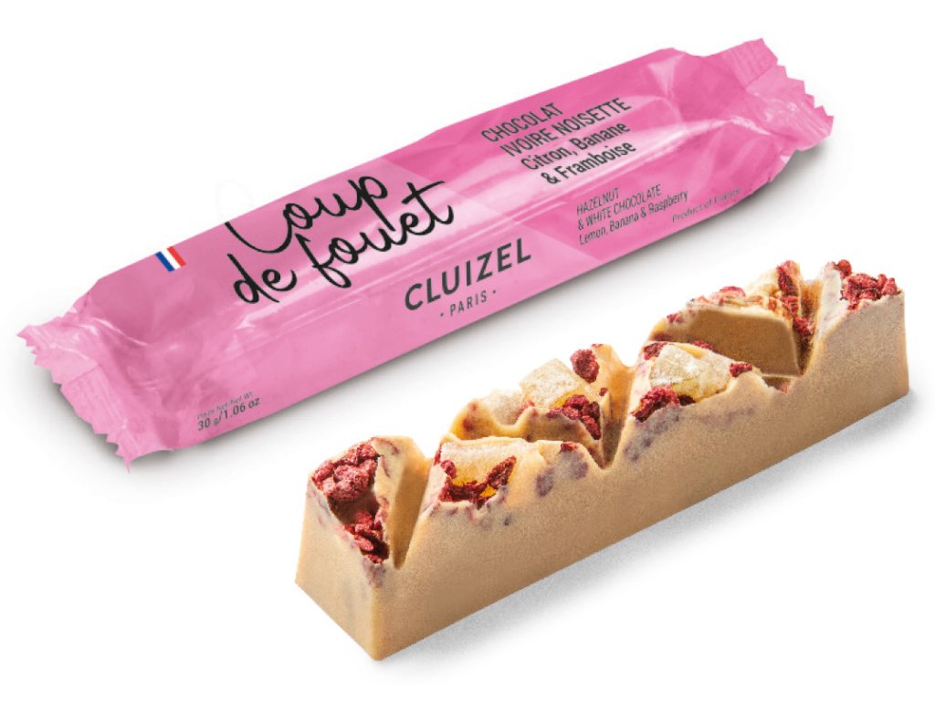 - 30g pralinková tyčinka Rychlá vzpruha Michel Cluizel z bílé čokolády s hladkým lískooříškovým krémem, kousky mrazem sušených malin a špetkou citrónu