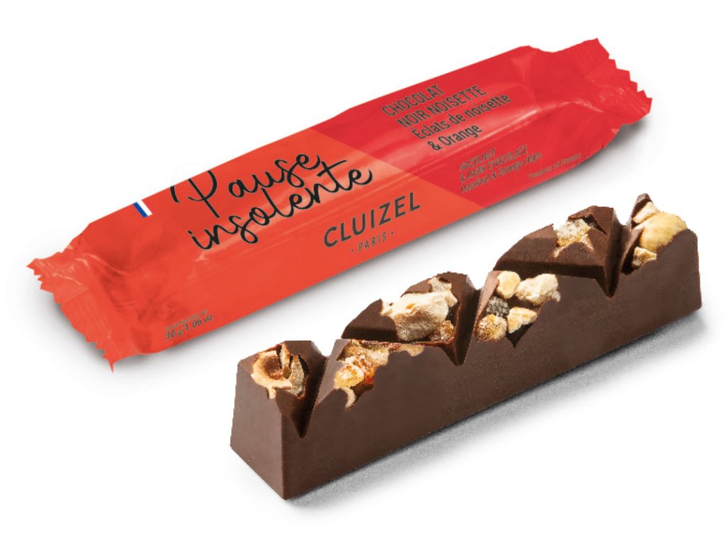 - 30g pralinková tyčinka Troufalá pauza Michel Cluizel z tmavé čokolády, lískooříškového krému, sypaná kousky lískových oříšků a kandovaného pomeranče