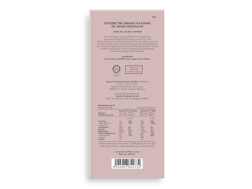 Výrobce: Benns Ethicoa Bean To Bar Chocolate Factory, Batu 11, 43200 Cheras, Selangor, Malajsie