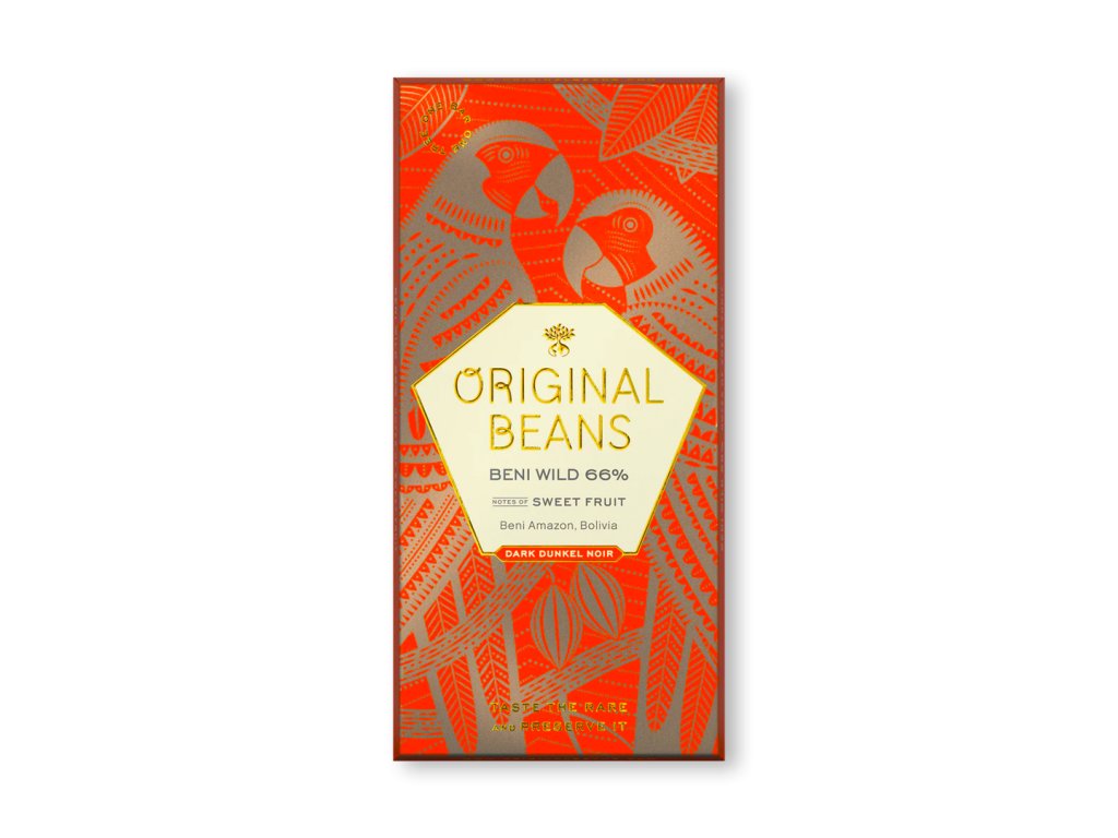 Hořká BEAN-TO-BAR 66 % čokoláda z kakaových bobů z Bolívie. Chuť ovocného medu a jasmínového čaje se v této čokoládě z nejvzácnějšího kakaa Beniano rozeznívá stejně živě jako poslední arové modrohrdlí v divokých lesích Beni. Domorodí sběrači kakaa se ke svým stromům často dostanou pouze na kánoích.