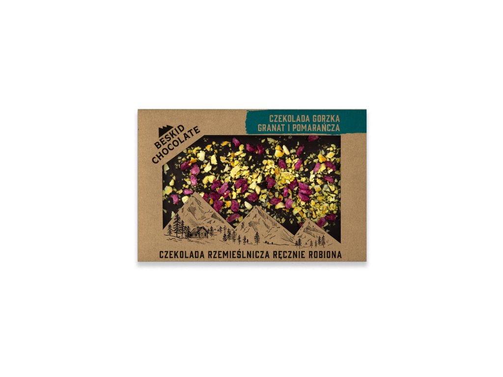 Hořká BEAN-TO-BAR 72% čokoláda s granátovým jablkem a pomerančem. Tato hořká čokoláda z manufaktury Beskid Chocolate je skutečným čokoládovým uměleckým dílem. Vysoký obsah kakaa v kombinaci s lyofilizovanými pomeranči a granátovými jablky vytváří neopakovatelný chuťový zážitek. Nápad na dárek?...