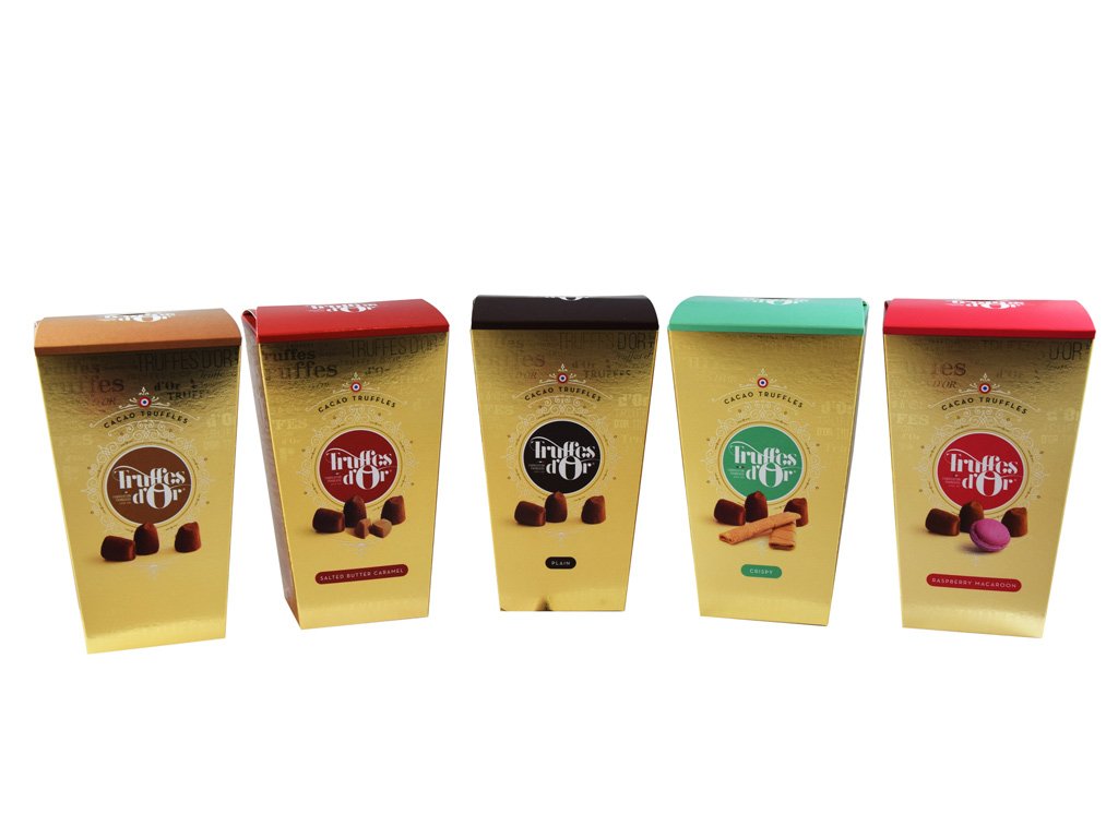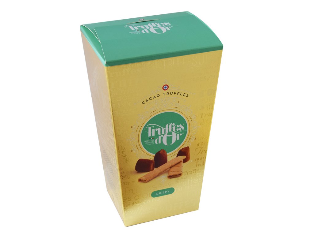 Delikátní francouzské kakaové lanýže s křupavými francouzskými palačinkami Crêpe dentelle v elegantní zlaté krabičce, ze „zlaté“ edice (d'Or = ze zlata) francouzské čokoládovny Mathez.