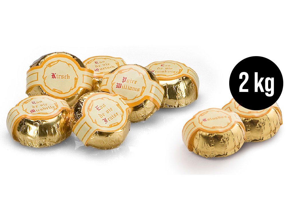 Příchuť čokolády: | S PŘÍCHUTÍ, — ALKOHOL:, Calvados, Fraise, Framboise, Kirsch, Mirabelle, Poire Williams, Quetsch |