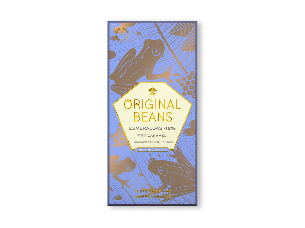 Mléčná BEAN-TO-BAR 42% čokoláda s hedvábnými tóny karamelu, lískových ořechů a soli, které se v této čokoládě ze vzácného kakaa Arriba vznášejí jako mlha v mlžném tichomořském pralese, kde se vyhřívají rosničky.