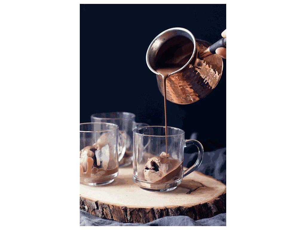 Recept na 2 malé šálky tradiční horké „husté“ čokolády: Přichystejte si cca 50 g čokolády (cca 2 vrchovaté polévkové lžíce), 100 ml cca 12% neslazené smetany (popř. mléka). Nalijte smetanu do vyšší misky, hrníčku s uchem nebo rendlíku. Vložte nádobu do horké vodní lázně v širším hrnci a zahřívejte až se voda ve vodní lázni dostane do varu. V průběhu zahřívání vmíchejte čokoládu, popř. cukr. Za stálého míchání povařte cca 3 minuty, až čokoláda dosáhne příjemné hladkosti a hustoty. Nechte mírně zchladnout na teplotu vhodnou k pití a poté servírujte. Čokoládu můžete dochutit i kořením. Více se dočtete v našem článku Domácí horká čokoláda.