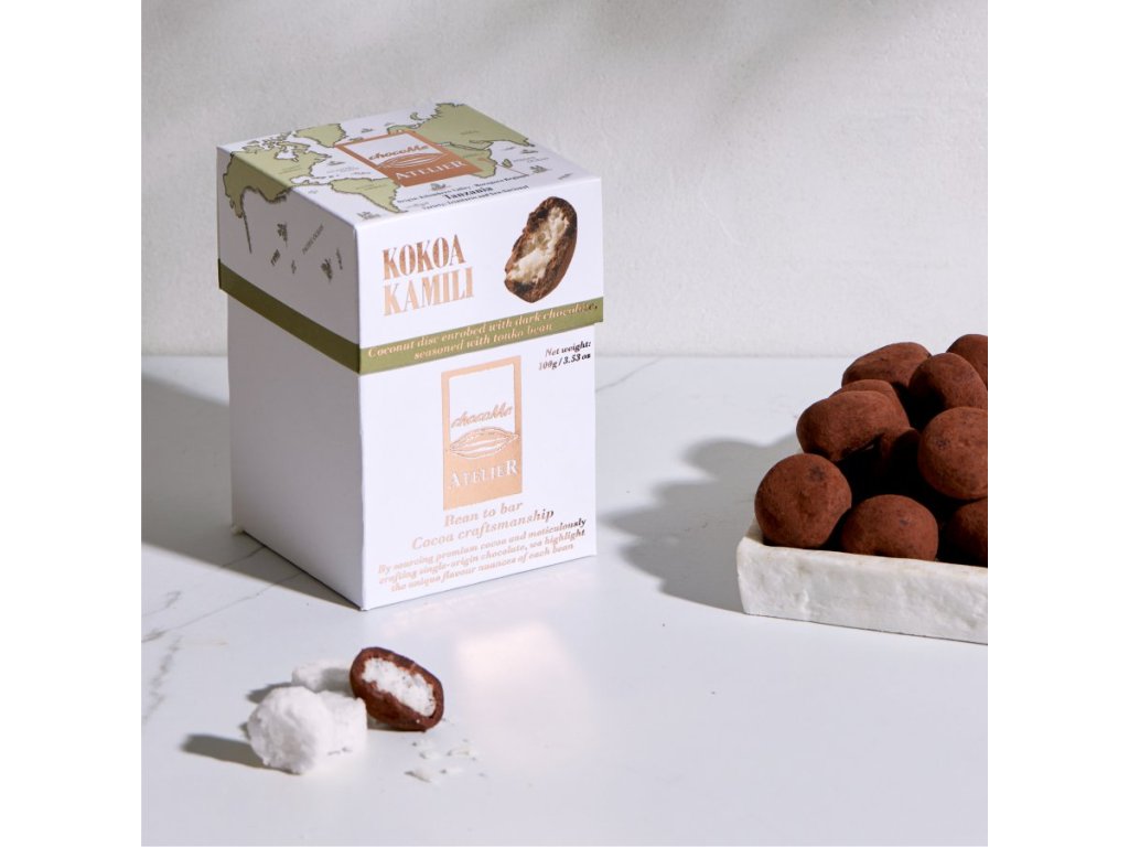 Další mistrovský kousek z AtelieRu s čokoládou z tanzanských kakaových bobů Kokoa Kamili - kokosový kotouček, který dražéři obalili v exkluzivní čokoládě Kokoa Kamili obohacené o mletý tonka bob. Sušený kokos ze Srí Lanky, pocházející z ekologického zemědělství, se míchá s pufovanou rýží a rýžovým sirupem, zformuje se do kotoučků a následně opéká pro dokonalou křupavost. Tento kokosový skvost se pak obaluje v čokoládě s aromatickým tonka bobem, který dodává nezaměnitelný charakter. Stačí jeden kousek a budete vědět, proč je tonka bobu přezdíváno "fazolka štěstí".