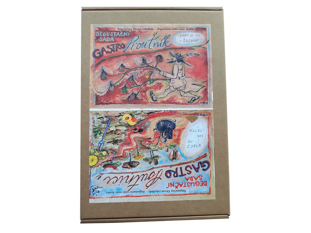 Toužíte ochutnat divné čokolády, ale zároveň se jich trošku bojíte? V téhle „Velké degustační sadě pro Gastropoutnice i Gastroproutníky“ můžete uždíbnout z 16 druhů Štěpánčiných čokolád (každý vzorek má 10 g) a navíc se pokochat miniaturami jejich obalů. Hodí se i pro komorní degustaci s přáteli nebo rodinou.